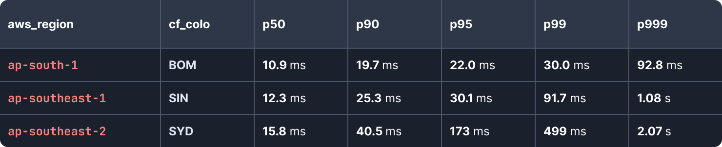 Fastest of all, ap-south-1 (Mumbai) opened in 2016 and has a p50 latency to the nearby Cloudflare BOM PoP of 10.9ms. Second, ap-southeast-1 (Singapore) opened in 2010 and has a p50-latency to the nearby SIN PoP of 12.3 ms. Finally, the ap-southeast-2 (Sydney) region opened in 2012 and has a p50 latency of 15.8ms to the nearby SYD PoP.