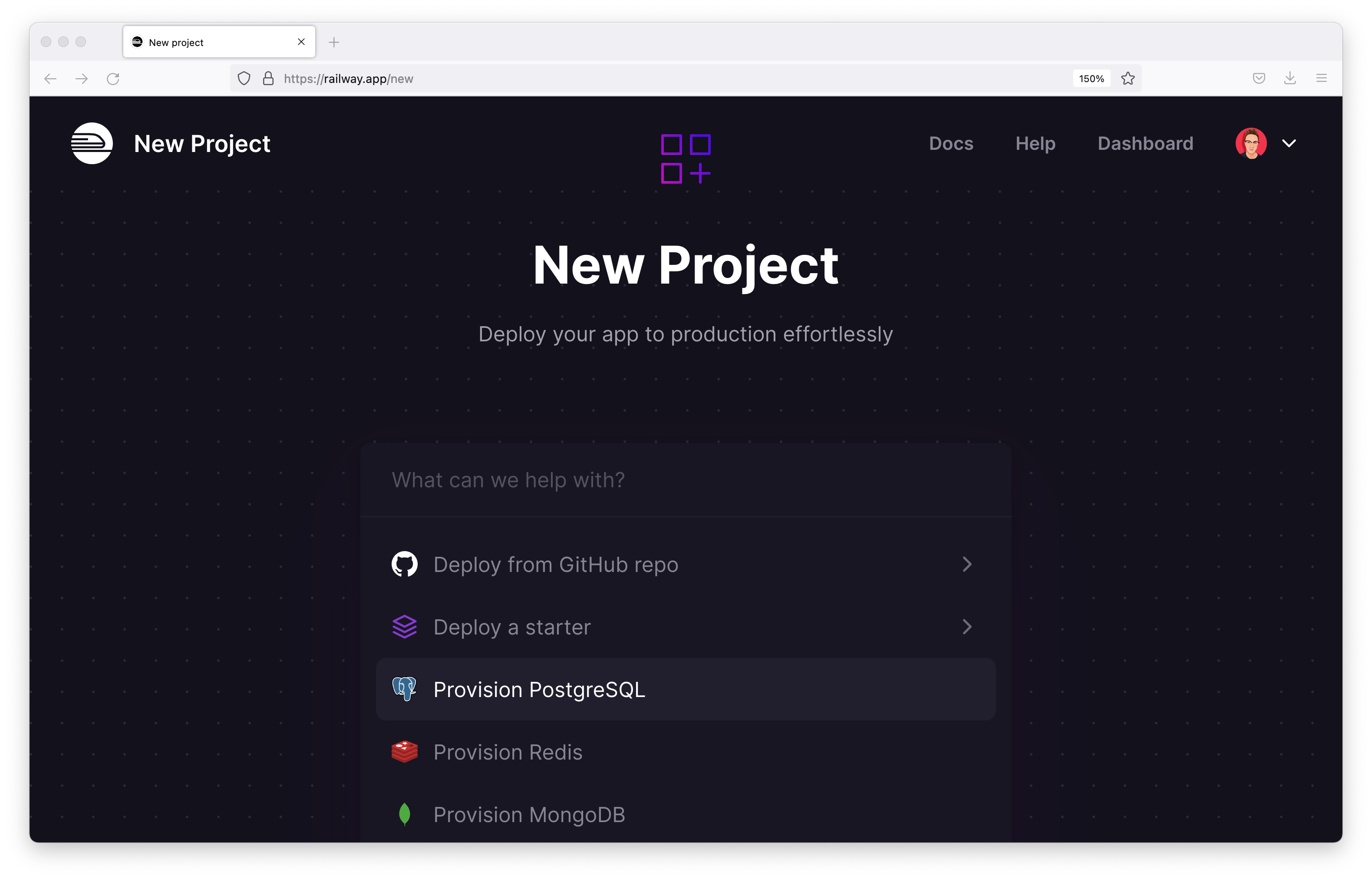 You will be presented with a search box and a few common options. Select the Provision PostgreSQL option.