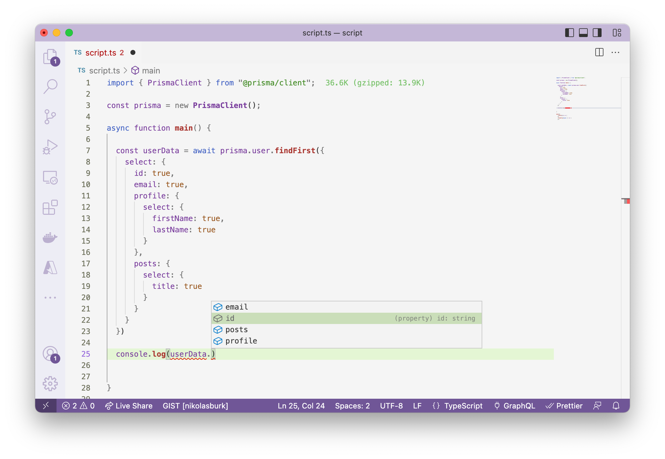 - The TypeScript compiler will catch cases where you accidentally access a field that was not returned from the query.