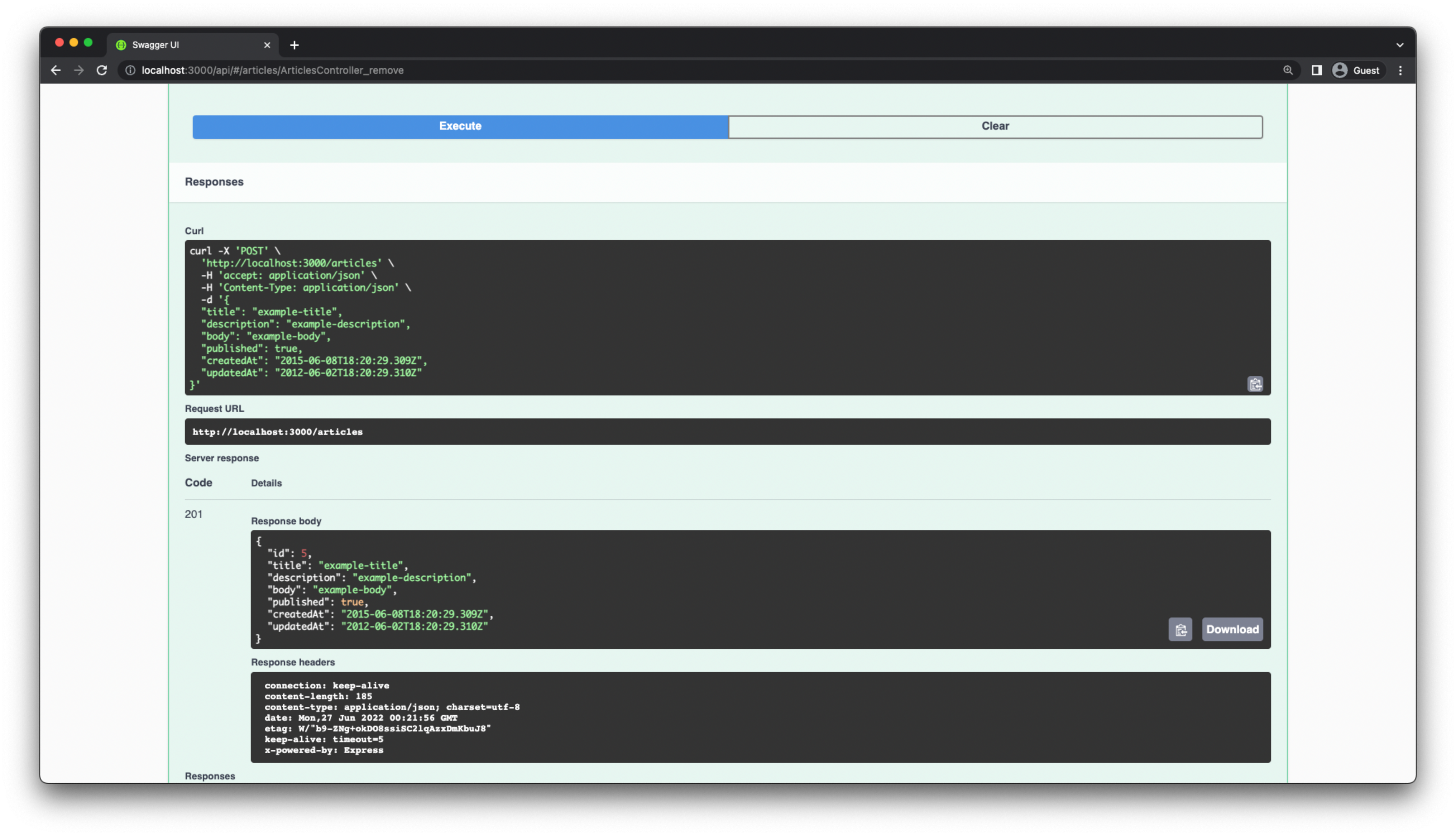 To give an example, try sending the following request to the POST /articles endpoint: