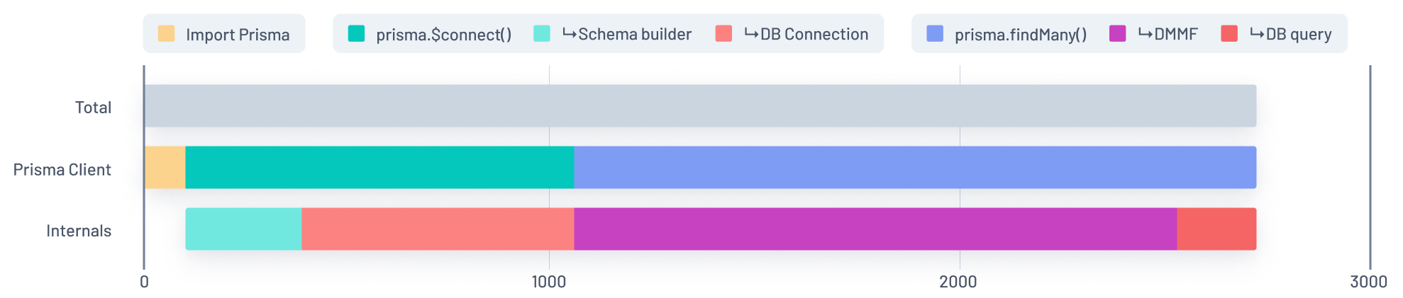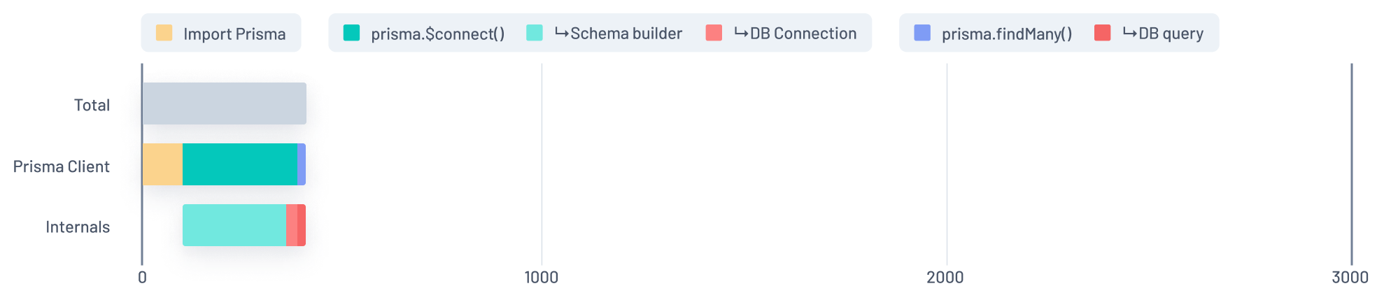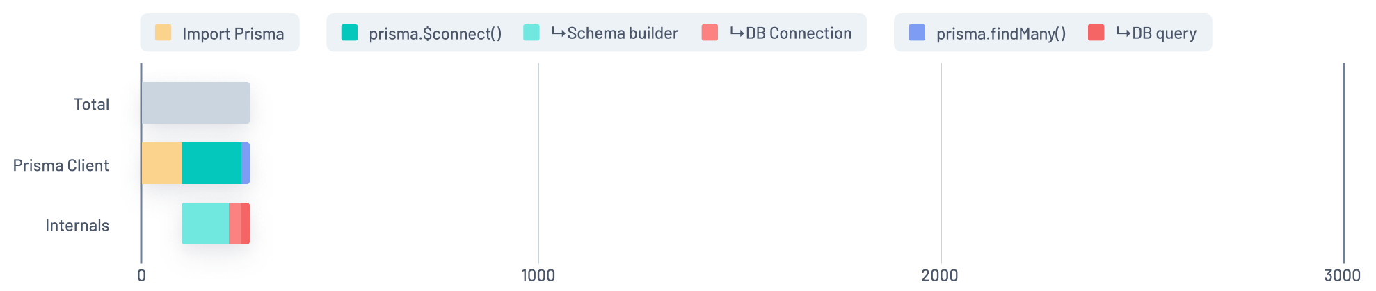 In this graph, the Blue section of the Prisma Client bar represents the time spent running a findMany query during a function's initial invocation. That time is split into two chunks in the Internals bar: Purple and Red.