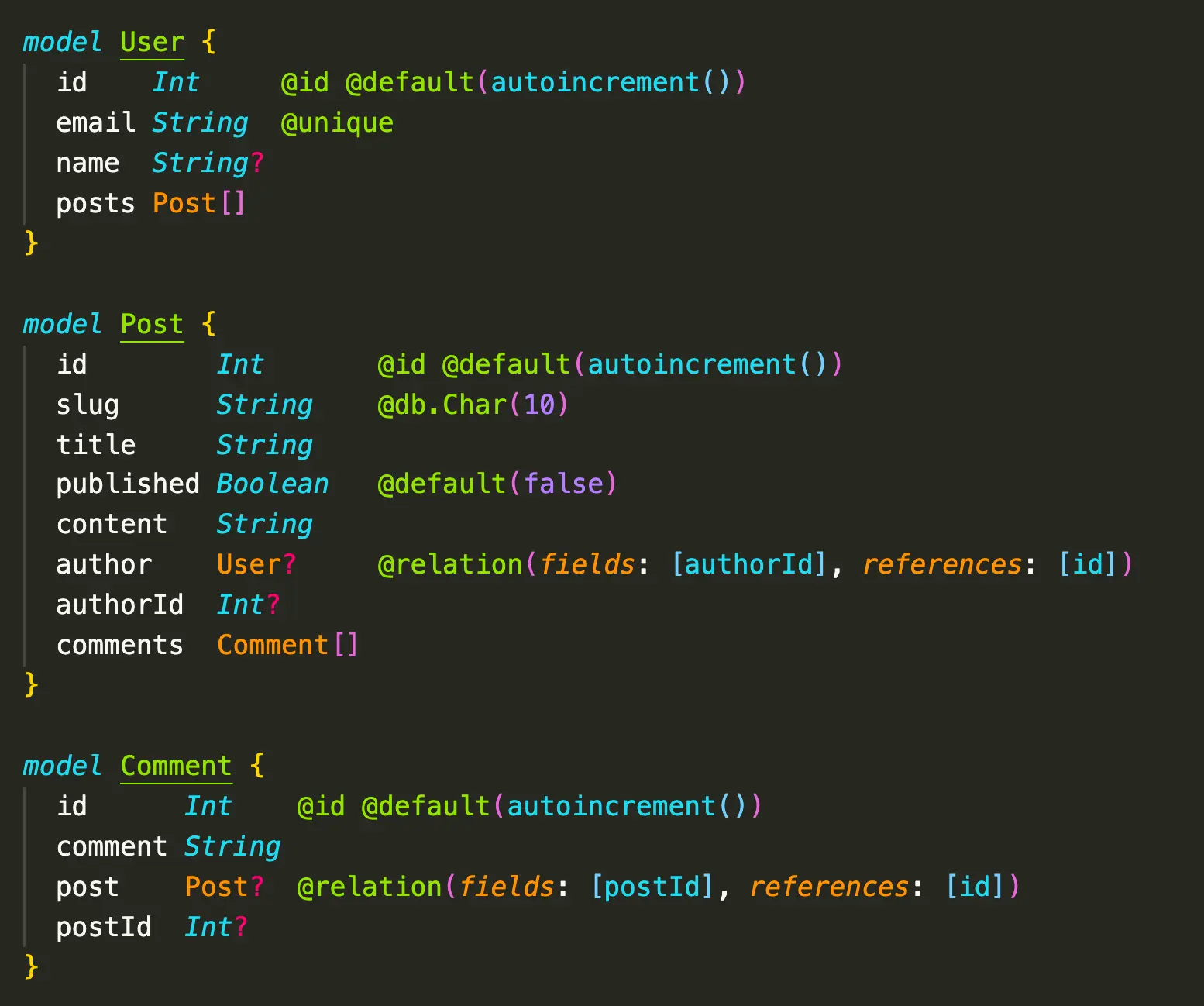 The Prisma schema language tries to strike the right balance between being self-explanatory and expressive. Self-explanatory means that even with no familiarity, you can still comprehend the data model, and expressive –in this context– means that you can effectively design your desired database schema without falling back to raw SQL (with relational databases).